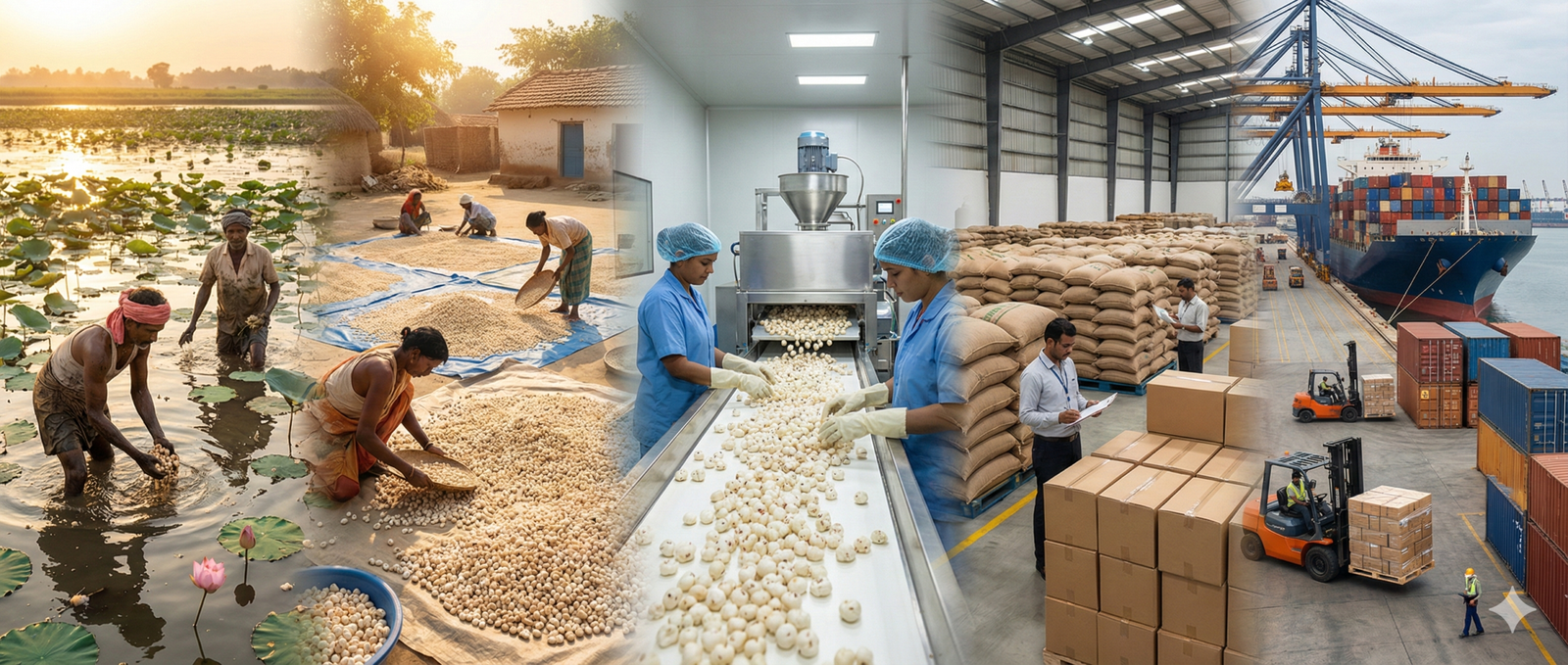 The journey of export-quality makhana begins at carefully selected farms in Bihar, where harvesting is done with precision and experience. Post-harvest, the seeds undergo drying,