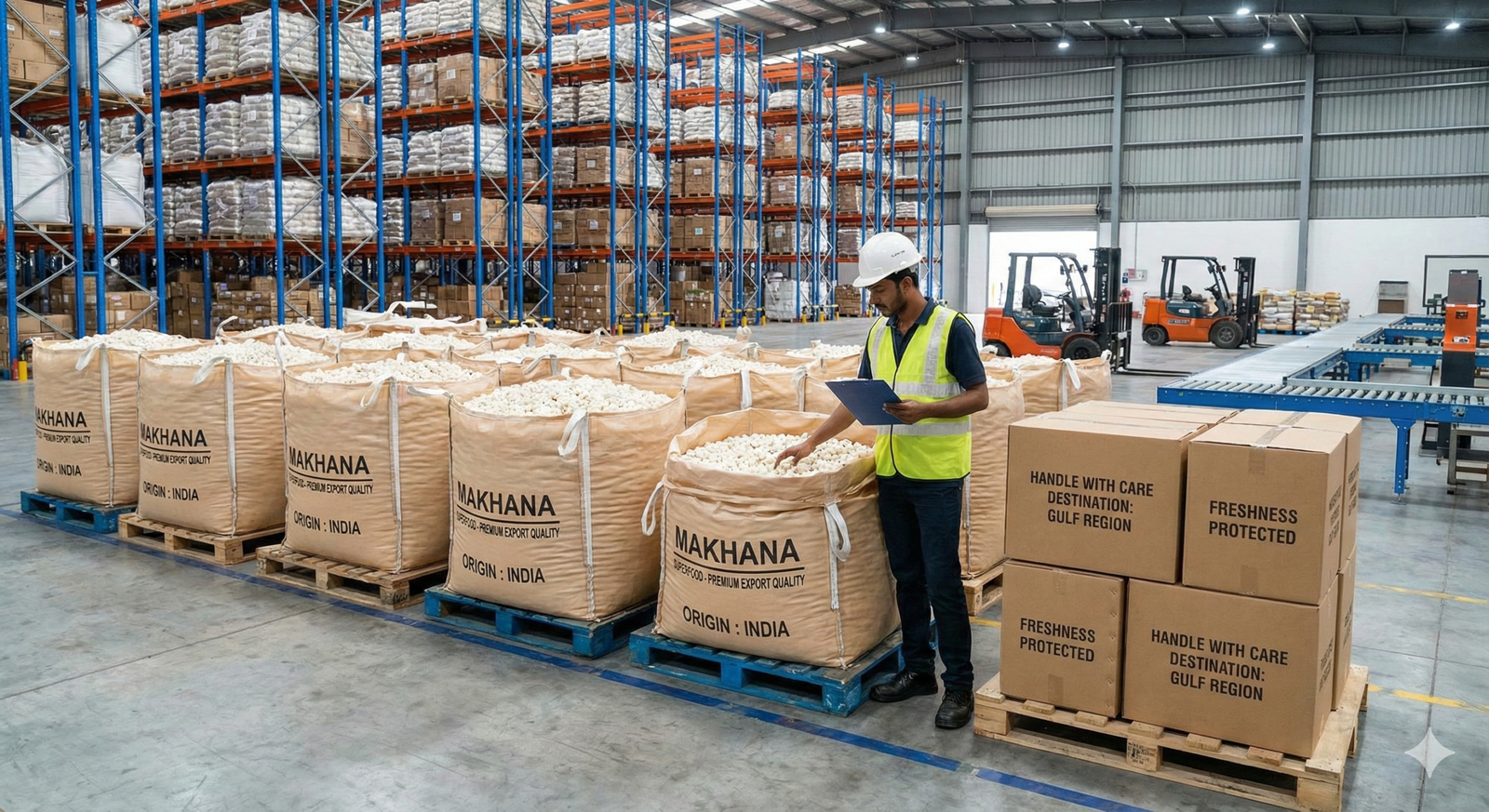 Makhana is sensitive to moisture, so we take extra care. Our packaging is specifically designed to maintain freshness and crispness during international transit, using moisture-barrier materials to prevent the product from going soft.